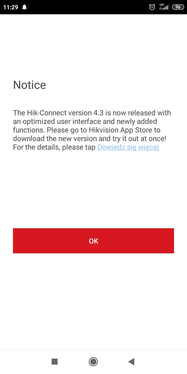 Компанія Progucent Hikvision випустила нову версію свого мобільного програмного забезпечення для Android, Hik-Connect версії v4.3, в додатку зі старою версією з'явиться повідомлення