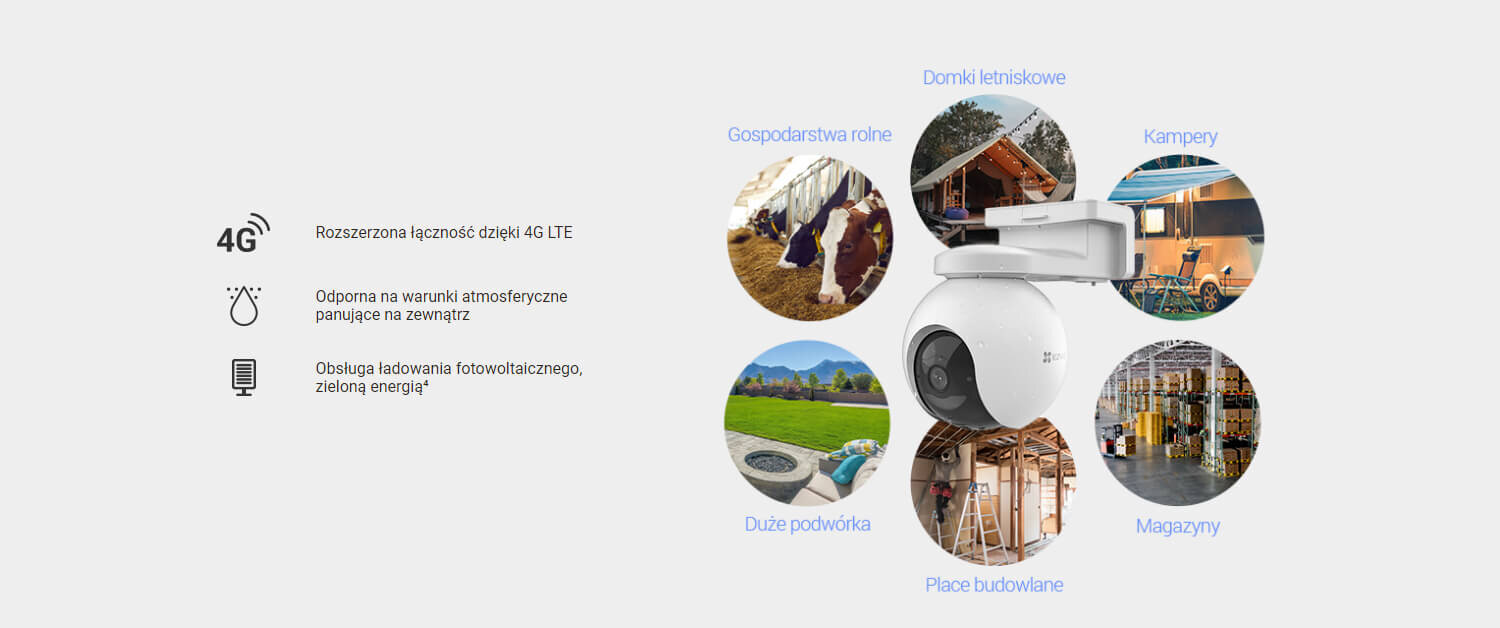 Тепер стало набагато простіше забезпечити захист там, де він вам найбільше потрібен. Новітня камера EZVIZ EB8 4G/LTE - це відповідь на обмеження, пов'язані з відсутністю доступного інтернету або джерела живлення. Акумуляторна камера EB8 4G - це все про переваги - без складнощів ... і кабелів! Камера працює в мережах 4G LTE на відкритому повітрі, де Wi-Fi не завжди доступний. Вона підтримує ключові функції популярних вуличних акумуляторних камер EZVIZ, забезпечуючи розумний і надійний захист 24/7.