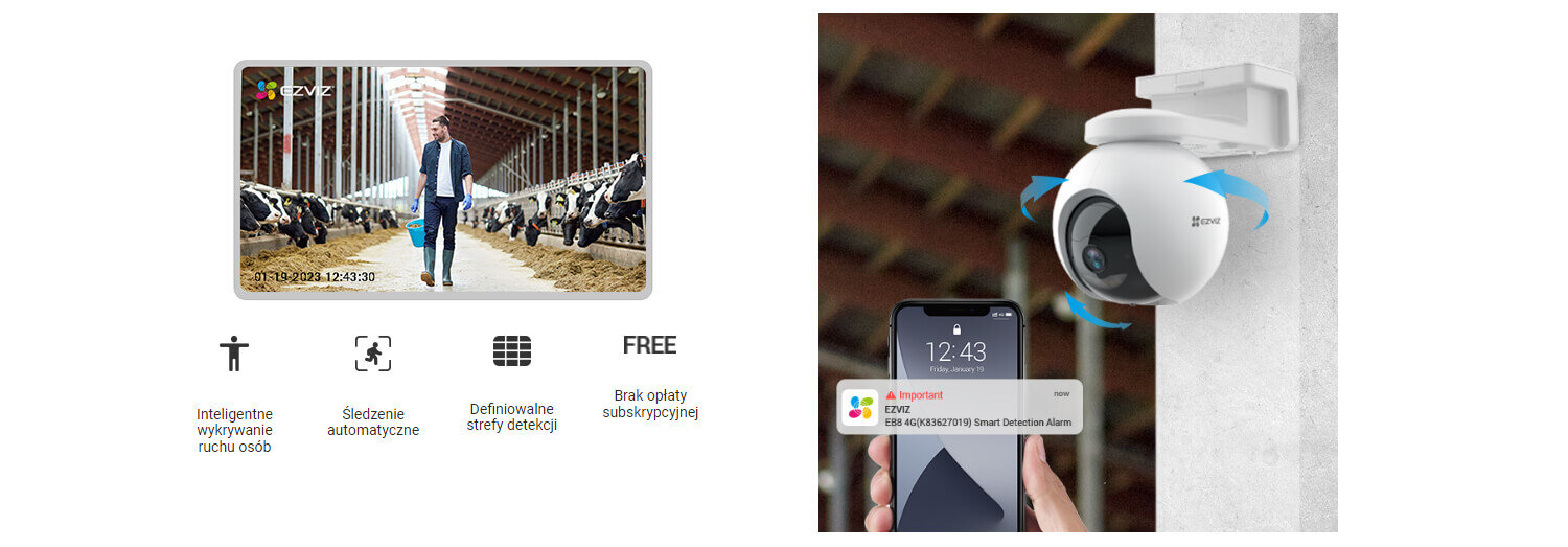 EZVIZ EB8 4G/LTE надає розумні сповіщення про виявлену активність. Ви можете увімкнути виявлення руху будь-якого типу, включаючи тварин, що біжать, на камері або увімкнути інтелектуальне виявлення руху людини, щоб автоматично відстежувати активність людей.