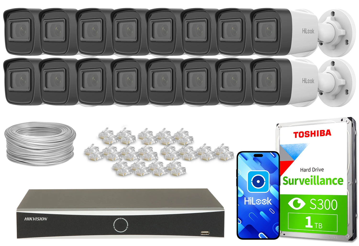 Zestaw do monitoringu składający się z sześciu czarnych kamer HiLook, dysku twardego Toshiba S300 oraz rejestratora. W zestawie znajdują się również kable i akcesoria montażowe.
