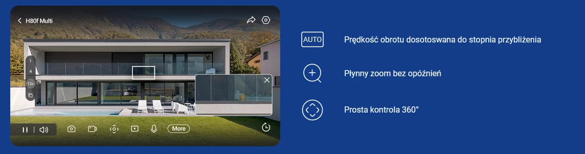 Завдяки продуманим функціям і передовим технологіям камера H80f Multi забезпечує максимальне задоволення користувача. Навіть швидке наближення вночі не порушить плавність роботи камери. H80f автоматично регулює швидкість і діапазон панорамування для отримання максимально чіткого зображення.