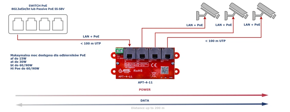 - jako rozdzielacz dla 4 odbiorników PoE (kamer IP) zasilanych z jednego przewodu UTP np. montaż dodatkowych kamer w miejscu już istniejących kamer bez wymiany okablowania
